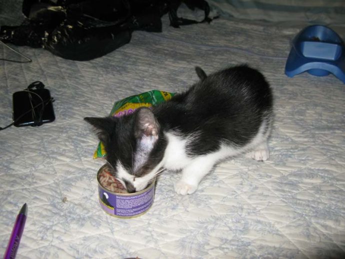 One of my first photos of Cleo. She may have been 7 to 10 weeks old. This was her first meal. She was not so afraid that she did not eat. She ate with gusto. That is a 3 oz. can, the small ones.